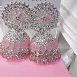 Crystal Floral Jhumka Earrings, Pink and Silver, Traditional Indian Style with Rhinestone Embellishments